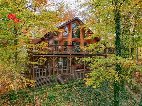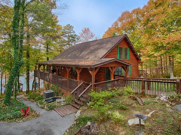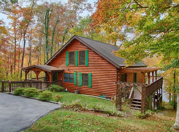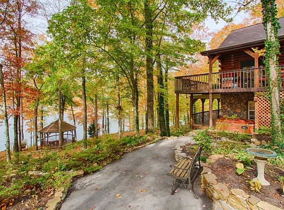 This stunning log cabin nestled in the woods, offers lakefront living on the premier Norris Lake. Come inside to enjoy the cozy layout offering an open living room and soaring ceilings. Admire the beautiful views of the lake through the wall of windows. Additional living quarters are located on the lower level, including a family room and fireplace. Walk outside on the wrap around deck and make your way to the lake. With a gentle slope to the water, this home is truly a rare find!