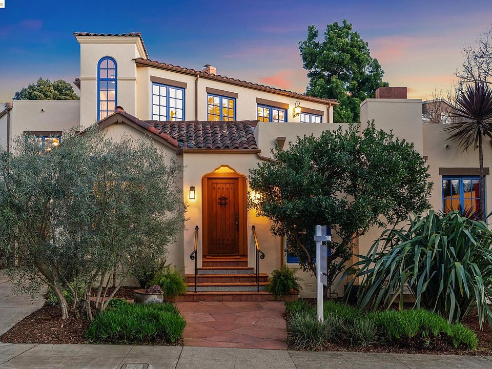 Inside 242 Palm, discover a Spanish Eclectic style home meticulously transformed by architect John Malick. Ascend the main stairs to a beautiful light-filled space with high ceilings and hand sculpted details that bring in a feel of Tuscany. A chef’s kitchen and open dining and living room exudes warmth and togetherness, while double french doors open to an entertainer’s paradise; perfect for large parties or intimate dinners under café lights. The terraced yard features fruit trees and a vegetable garden. The upper level includes a primary bedroom with en-suite bath as well as an adjacent office/nursery. The lower level offers a spacious play room, two bedrooms, full bath, a guest bedroom with en-suite bath, and a private home theater for unforgettable movie nights. Complete with a two-plus car garage and ample storage and workshop. This well maintained, exceptional home is nestled in a friendly neighborhood celebrated for its festive spirit and close proximity to Piedmont schools.