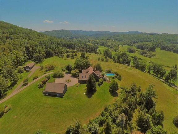 Commanding views overlooking Salmon Kill Valley's prestigious farmland create a majestic setting for this 4 Bedroom, 4.5 Bath home. An elegant circular drive, lined with gardens and mature plantings, approaches this pristine estate. Thoughtfully designed to enjoy privacy surrounded by distant views, the light-filled Living/Dining Room with cathedral ceiling and Rumford Fireplace, joins the home's Eat-In Kitchen & Screened Porch, Library, and First Floor Master Suite with Jacuzzi tub overlooking the Valley. The Upper Level Foyer with open Balcony joins an additional en suite Bedroom, plus 2 more Bedrooms and a Full Bath. Expansive Lower Level Recreation Room with Hand-Crafted Mahogany Bar and a Full Bath opens to the Heated Saline Gunite Infinity Pool, providing a dramatic and cohesive entertaining space.10+ acres in one of Salisbury's most desirable locations, this country estate also offers a 2-car attached garage, a heated Party Barn with spacious Upper Level and incredible views, a heated 50x30 4-Bay Workshop with its own driveway - and a picturesque setting for living, playing, and entertaining in the heart of the Litchfield Hills.