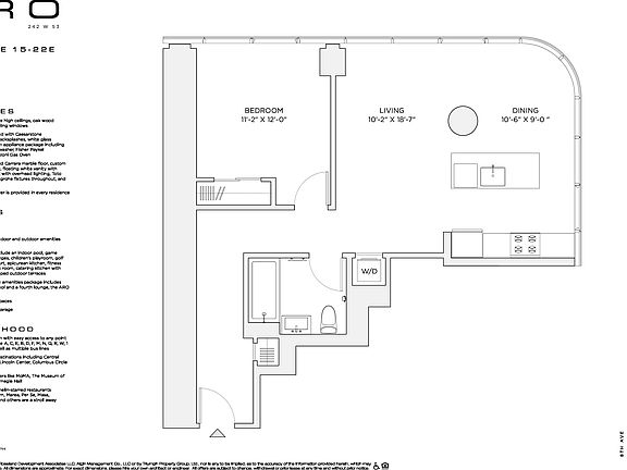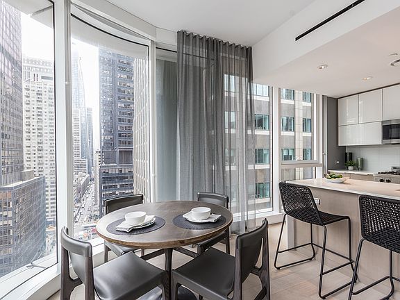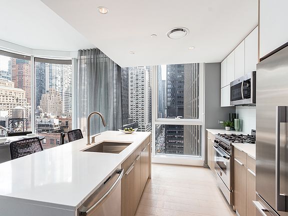 Threshold of your luxurious ARO one-bedroom residence invites you into a sanctuary of contemporary design. Oak wood flooring, high ceilings and premium finishes are bathed in natural light streaming from floor to ceiling windows. A thoughtfully laid out floorplan harmonizes your living and dining areas making for stylish entertaining as well as relaxing functionality. A separate kitchen is thoughtfully designed and composed of custom cabinetry, solid surface quartz countertops and stainless steel appliances. The bathroom features beautiful marble, a Kohler bathtub, floating vanities and high-end fixtures, and each residence boasts Bosch brand washers and dryers. Wake up to dramatic views of the outside. Rising over 60 stories above the urban vibrancy of Midtown West, the interior of your residence reflects the vistas embraced by the fluid curves of the buildings award-winning design. CetraRuddys sculptural cantilevered architecture has reimagined the classic skyscraper for our era and beyond. Inside of AROs white metal lattice shell and glass form are more than 40,000 square feet of indoor and outdoor amenities to enhance residents lifestyles and make time spent at home well curated and convenient. ARO provides residents with resources as close to hand as possible to reinvent luxury apartment living. Avail yourself of the full concierge services as well as 24/7 doormen and attended parking; relax, host or work in one of the buildings three distinct lounges, get a move on in the indoor pool, game room, childrens playroom, simulated golf course, basketball court and fitness center with yoga room, and entertain guests in the epicurean chefs kitchen with private dining room and landscaped terraces. Midtown West is a bustling testimonial to the storied allure of Manhattan living. AROs sweeping vistas are rivaled only by its extraordinary location in the city center and close proximity to celebrated restaurants, shopping, museums, cultural institutions, entertainment and nightlife. If you need nature underfoot, try a quick trip on one of the multiple subway lines near your doorstep to iconic Central Park or the creatively transformed Hudson River Park corridor. Photos and videos are from similar units. Please refer to the floorplan.