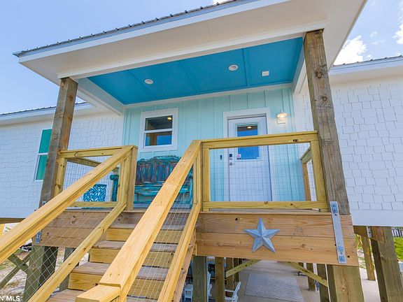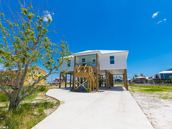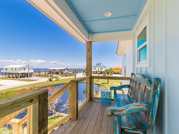 Experience Fort Morgan at its finest with this Gold Fortified, Custom Construction home recently built in 2021. Located on Mobile Bay, every room offers breathtaking water views. Impeccable attention to detail and high-quality finishes adorn this modern beach house. The open concept living/dining/kitchen area boasts a spacious layout, while French doors in the living area invite the stunning views inside. Enjoy the expansive 550 square feet of covered porch and deck, perfect for relaxation. With 12-foot ceilings in the living room and a split floor plan offering en-suite baths in each of the four bedrooms, privacy and comfort are ensured. The kitchen features a breakfast bar, custom granite countertops, stainless steel appliances, and elegant Shaker cabinets. This fortified home boasts a hardy board exterior, metal roof, and foam insulation. Additionally, there is ample parking beneath the house, making it convenient for family and friends. The thoughtful planning even includes sturdy support beams for storing a center console boat, trailer, or RV. Delight in the inviting front porch, complete with graceful paddle fans. Despite its private location, this home is conveniently situated near numerous attractions, including world-class golf courses, the Fort Morgan marina, and exceptional charter fishing opportunities. Don't miss the opportunity to indulge in the best of both worlds - captivating sunsets from your porch and walks along Fort Morgan's renowned white sand beaches.