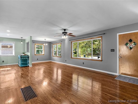 Beautifully updated 5 bedroom, 2 full bath home with detached 2- car garage featuring brand new automatic doors! Step inside to a bright, open floor plan with STUNNING REAL HARDWOOD FLOORS throughout the main level! You'll love the living room, dining area and kitchen that flow seamlessly together and are filled with natural light! The kitchen shines with granite countertops, soft-close cabinetry, and a convenient pass-through opening to the dining area. A large primary bedroom, full bath, and 2 additional bedrooms complete the main level. The finished lower level includes a large rec room, 2 non-conforming bedrooms with large closets, a full bath, laundry, and utility room. Outside, enjoy a fully fenced yard, screened-in patio, and detached 2 car garage with 220V plug ready for your electric car. Updates include WINDOWS REPLACED THROUGHOUT ENTIRE HOME (2023), HVAC (2020), water heater (2022), and water powered sump pump (2019). Fresh paint and waxed floors! Truly move-in ready and waiting for you in the most convenient New Albany location!