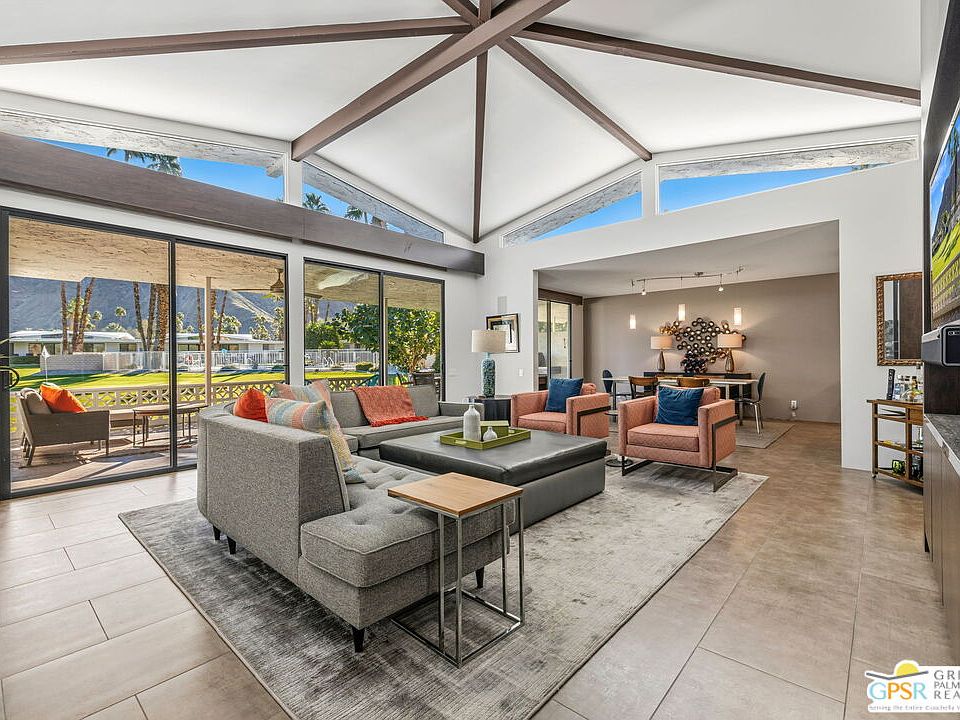 Iconic architecture by Charles Du Bois, AIA sets the tone for this stylish residence in Canyon Estates, where panoramic golf course, pool, and mountain views pair with resort-style amenities and modern design. Located on land you own, this premier residence is just minutes from restaurants, retailers, hiking, and everyday conveniences. Ownership at Canyon Estates offers a true resort lifestyle, including an executive nine-hole golf course, fifteen pools, twelve spas, clubhouse, fitness room, pickleball and tennis courts, and comprehensive HOA services such as exterior landscape maintenance, building insurance, exterior paint, pest control, and premium cable and internet. Arrive to inviting curb appeal framed by surrounding mountains and step into a private courtyard that introduces the home's incredible views. Inside, the formal entry opens to a light-filled living area featuring vaulted ceilings with exposed beams, six clerestory windows, and two sets of sliding glass doors that extend living and entertaining to the outdoors. The gourmet kitchen impresses with modern cabinetry, quartz countertops, glass tile backsplash, dual sinks, and a built-in stainless-steel appliance suite including gas cooktop and dual ovens. Counter seating overlooks the dining area, which also enjoys views and direct outdoor access. The kitchen offers convenient entry to the attached two-car garage. The reimagined Primary Ensuite is a serene retreat with sweeping views, walk-in closet, and spa-inspired bath featuring dual sinks, oversized walk-in shower, and a separate soaking tub. Bedroom Two offers vaulted ceilings, views, a walk-in closet, and easy access to the hallway bath. Inside laundry completes the home. A timeless architectural classic paired with effortless resort living. This is Palm Springs at its best.