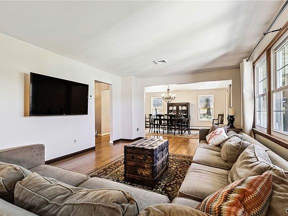 Sprawling Raised Ranch in the West Genesee School District. Over 3700sf of living space with an expanded attached 3 car garage. This gem sits on a private 1.48 acre lot with a creek running through the back of the property. Five total bedrooms and 3.1 bathrooms, including an In-Law Suite with wide plank hardwoods, kitchenette and new full bathroom. The master bedroom has a walk-in closet, its own private office and a remodeled luxurious bathroom. Formal living room, dining room and updated kitchen have new bamboo floors. The kitchen has new appliances and an eat-in nook. Three spacious bedrooms on the ground floor with a new full bathroom complete with 3 vanities. Large 2nd living room with a pellet stove and whitewashed fireplace. Walk out to a large wrap around deck leading to your above ground pool. Massive sheds with shelving provide ample storage for pool and yard equipment. This house has the best of both worlds with zoned boiler heat and a forced air furnace with Central Air. Many updates and well maintained, this property is one of a kind.