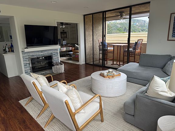 Quiet, bright and spacious top level unit at the far end of the complex with secured elevator access to the unit. Great modern kitchen, stainless steel appliances and indoor laundry. Open and bright living room has a fireplace and attached private patio. Large bedrooms with plenty closet space. 3rd bedroom is open and used as an office with large windows and book shelves. Laminate flooring throughout. Unit comes with 2 reserved parking in an under ground garage with openers. Gated complex with secure access, large pool and plenty outdoor space. Walking distance to La Jolla Shores beach and park with easy access to UCSD, shops, airport and freeways. Min. of one year lease. Tenants pay all for all utilities including cable and Internet.
