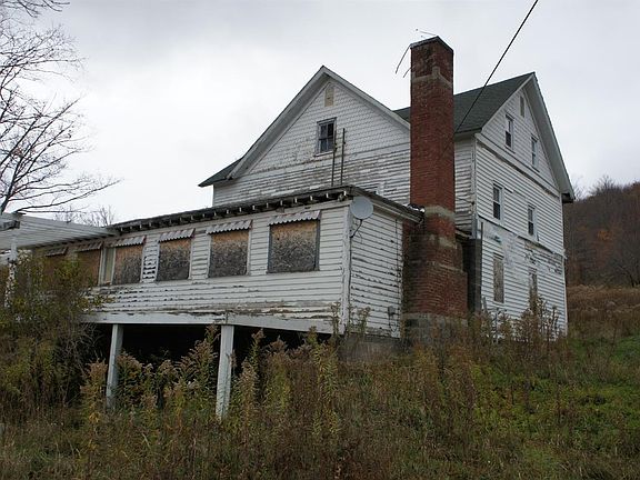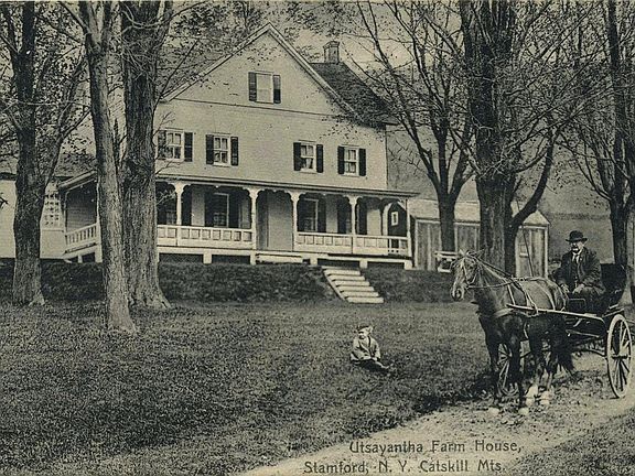 Former summer resort Mount Utsayantha Farm House on the shoulder of Mt. Utsayantha in Stamford New York. Three buildings including a large three story lodge, two story annex and large barn. The core of the lodge is a post and beam farm house from the 1840's that has been expanded upon and developed into the building you see now. There are 13+ acres, bordering N.Y. City lands to the south, with open and wooded areas including a large pond. Evidence of the property's use over the years is evident with basketball court and shuffleboard, walled gardens and former lawns. Beautiful views of the Delaware Valley to the west. This is a project and will require considerable effort to make into a usable residence again. There is a 200'+ deep drilled well, updated compliant septic(per seller)for 11 bedrooms and underground electric at the road. There is also a spring that historically fed water to the property. None of these services are currently in use. The interior of the lodge has large open rooms on the first floor including a former restaurant and tap room, dining room and commercial kitchen. A large brick fireplace is located on this floor. Upstairs are numerous bedrooms and a few bathrooms all in need of updating. Two and three plank doors survive from the early part of the house as well as wide board floors and hand hewn beams.Some windows have been replaced and a portion of the roof of the main building has been done. A deep veranda is in poor but salvageable condition. The two story annex has a former kitchen and dining room on the first floor and several bedrooms upstairs. This building has an older metal roof and is in sound condition. A two story barn/carriage house will require roof repair but is basically sound and attractive. Plenty of imagination and work will be required to bring this property back to life, the location,three buildings, pond and views make it worth the effort! Would make a great B&B or live/work location. Code compliant septic for 5 bedrooms installed in 2008. Historic views are postcards from the resort era of Stamford, Queen of the Catskills.