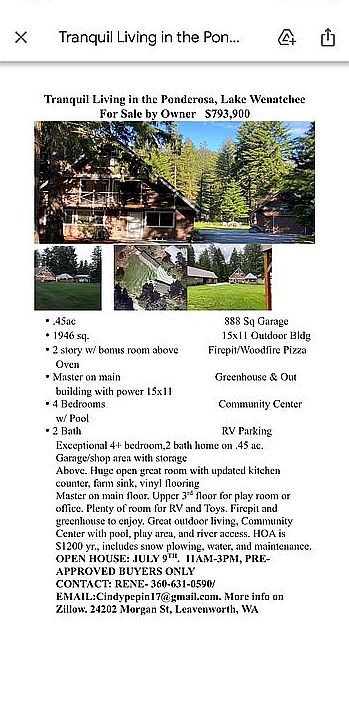 Ponderosa Estates, Plain WA Exceptional 4+ bedroom / 2-bath / 1946sf home 2 story with large 3rd floor bonus room.Enclosed out building 15x11 area w/power for an office in Plain! .45-acre setting backs up to community greenbelt, and is just a short distance from the community center with swimming pool, park, and river access. Huge open great room w/large kitchen & great room. Master on main, large shop,wood fire pizza oven,greenhouse