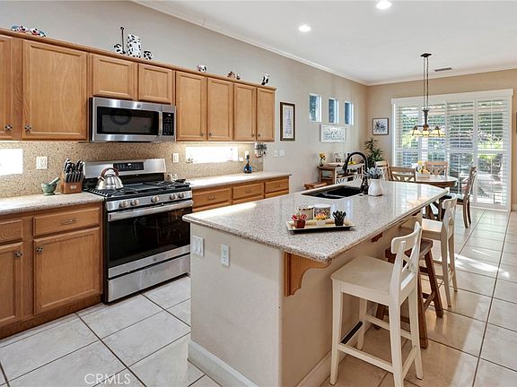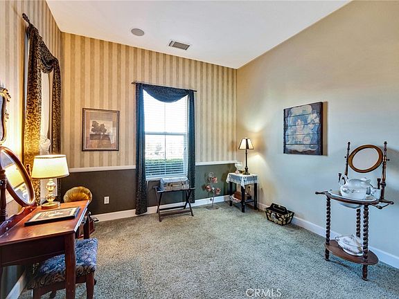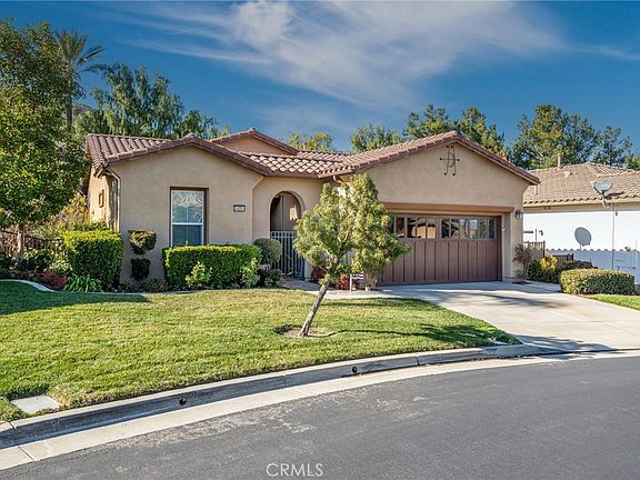 Trilogy at Glen Ivy is a highly sought after 55+ Resort Like Gated Community surrounded by the Ted Robinson designed public regulation Golf Course. This popular INAHA Model sports 1,552 sq ft of living space and an open and spacious floorplan. Silver/Grey speckled stone gated courtyard, continues to rear patio and side yard sidewalk. Alumawood type full patio cover. Custom designed floor tile pattern at entry into the home. Large family room with dramatic yet cozy fireplace, separate office/flex room, kitchen with a large granite countertop and granite backsplash with counter seating. Crown molding and large baseboards. Master bedroom with rear yard views with sliding glass doors. Double master bath sinks, great master closet organizers. Upgraded secondary bathroom with jacuzzi tub. Inside laundry. Fully fenced large yard, huge side yard with artificial turf. The HOA dues at Trilogy include front yard maintenance and access to HOA resort style amenities, including an outdoor amphitheater featuring live bands, a beautiful clubhouse with a Grand Ballroom for dinner and dancing events, both indoor and outdoor pools, a spa, a walking track, a gym, tennis courts, pickle ball courts, bocce ball, and easy access to the public Glen Ivy Golf Course.