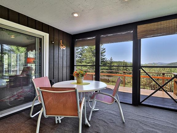 First time offered on market! A very special property boasting spectacular mountain views facing west with gorgeous sunsets and surrounded by land conservation. This impeccably maintained 2 bedroom plus den, open concept mountain contemporary is truly the ultimate VT vacation retreat. When you relax in this home you will experience walls of glass on both levels to soak in the amazing views. Chill after a day of play on the wraparound deck or dine in the screened in porch watching the sun go down. On colder nights get cozy in front of the wood burning fireplace. Great detached garage with storage above. World class skiing and golf close by. Hiking, biking, swimming and fishing minutes away. Act fast on this mountain gem. It will not last! (Please do not pull in the driveway without an appointment.)