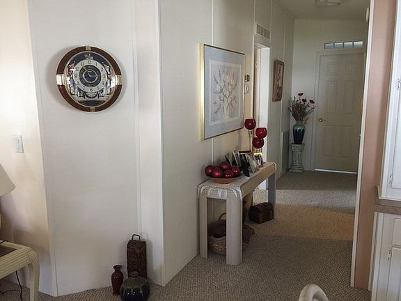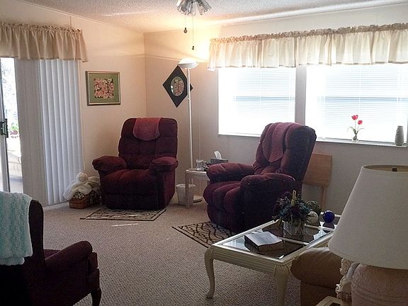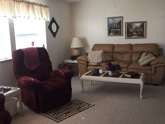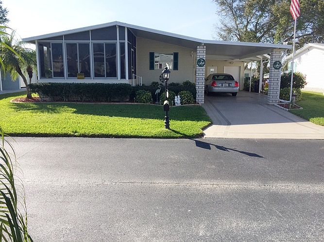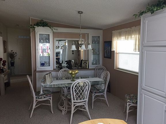 This home is located in a 55+ community where you own your house and rent the land. The lot rent is $511 which includes many amenities such as a clubhouse that includes a restaurant, party room, theater, library, craft room billiard room, excercise room, pro shop, shuffle board, boccie ball, lake for fishing and boating...etc. Great community. Looking for a beautifully furnished home that has been well taken care of and has upgraded appliances? Well look no further. Here is your next home. The lanai (or Florida room) is at the front of the house where you can watch your friends in the community wallk by. From the lanai you enter the living room and next is the formal dining room with a built-in hutch. This room opens to the eat-in kitchen with a small table. All appliances have been replaced in the last year. The two bedrooms are at the back and side of the house. The master bedroom is unusually large with 2 closets. The master bath has two sinks and a separate room for toilet and shower. The walls are freshly painted and new carpet has been laid in the hallway, living room and bedrooms. The laundry room has cabinets and desk for an office along with the washer and dryer. You can exit this room into the outside patio where you can park at least 2 cars.in the carport.. The shed is unusually large with room for your golf cart (included with the home) and plenty of room for your fishing gear, etc. This home will make someone a very nice place to live while enjoying the Florida Sunshine and playing in paradise. Give the listing agent a call to see this beauty. #FloridaRetirementHome #JacobsenHome #FurnishedHome #ActiveRetiree #LoveToGolf #GolfCartIncluded #LoveTheSun #Snowbirds #Emptynest #LetsRetire #RunFromWinter #EscapeTheCold #MoveToFlorida #Broker #ReneesResales