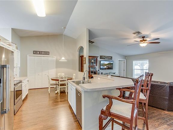 Live your dream in sunny Southwest Florida! Imagine waking up in the morning in your beautiful new home, making coffee in your newly renovated kitchen with a custom butcher block coffee bar and stainless steel appliances. Sit out in your oversized back yard catching the rays. This home boasts amazing features throughout that include new wood-look flooring, 5 1/4" baseboard, fresh paint inside, farmhouse style dining chandelier, and upgraded bathrooms. The entire home is smart enabled with motion activated kitchen faucet, ring doorbell, electronic deadbolt, phone controlled garage door, and wireless irrigation controls. Whether you are entertaining friends and family for dinner or just gathering to watch a movie, there is the perfect amount of space for groups small or large. You will also love the split floor plan that give ample separation from the master bedroom and 3 additional bedrooms.This house is ready for you to come make it your new home.