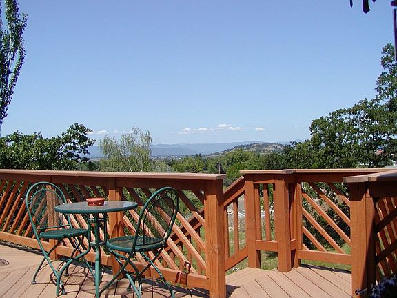 Single story with large finished daylight basement including second fireplace and French doors to lower patio. Large upper level composite deck on north and west sides of house. Corner lot has second driveway for access to covered and paved RV parking with full hookups including TV. Attached garage with built-in cabinets and workbench. Permanent storage/tool shed with built-in shelves and workbench on cement slab. Large attic with lots of storage. Large unfinished basement for storage. Large kitchen has granite counters, island, two ovens, desk, oak hardwood floors. Master suite includes sitting area with view and walk in closet. Electronic air purification system.