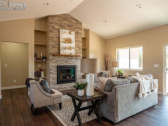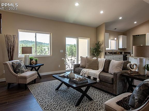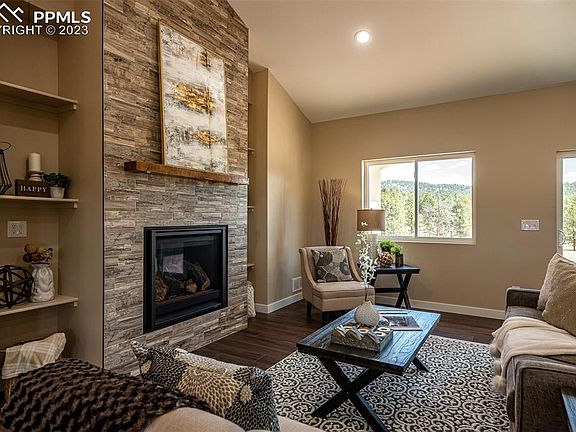 This brand-new 3-bedroom, 3-bathroom, 2-car attached garage home sits on 2.19 acres. From the covered front composite porch as you enter, the living room has luxury vinyl flooring; an entry coat closet; vaulted ceilings; a gas fireplace; built in shelves; and a walk-out to the deck for easy entertaining. From the large composite back deck take in the scenic views of Pikes Peak, rock formations, and other mountain landscapes. This open floor plan boasts a separate area for dining plus kitchen island sitting both with luxury vinyl flooring. The kitchen has all stainless-steel appliances; granite countertops; tall cabinets; a large island with storage underneath; and an attached 6x9 walk-in pantry with shelves. The carpeted main bedroom suite is tucked away with a private walk-out to back deck; an attached 5-piece bathroom with ceramic tiles, large shower, deep soaking tub, 2 individual sinks and cabinets, toilet nook area, and walk in closet. The 2nd and 3rd bedrooms are carpeted each with their own walk-in closet. The full bath has a large sink area and luxury vinyl flooring. The half bath is next to the large laundry room, and both have luxury vinyl flooring. The large 2-car garage is fully drywalled; has hose hook up; and garage door opener with programable keypad. Situated 3.5 miles away from the CME fire station; 8 miles from Florissant; 14.5 miles from Cripple Creek; 16.5 miles from Divide; 19.5 miles to Woodland Park.