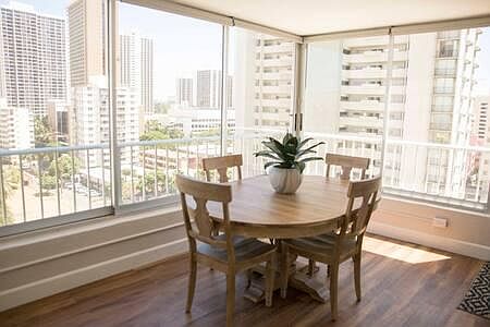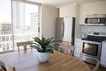 Secure building in the center of Waikiki only a short walk to the beach. Valley, mountain, Diamond Head and peekaboo ocean views. Full kitchen, washer/dryer in unit, 65 inch flat screen TV in living room and a 45 inch flat screen TV in the bedroom, Apple TV, and XBox. Designer furniture, king size bed, custom bathroom, stainless steel kitchen appliances, and 2 AC units. On a quiet street in the heart of Waikiki. One bedroom, one bathroom 610 sq ft condo. Fully remodeled as of August 2017. 6 or 12 month lease available. All utilities included