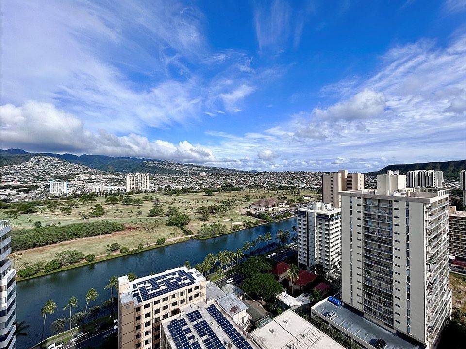 Enjoy this special oasis in a high-level unit above central Waikiki with incredible views of the canal, golf course, mountains, and peek-a-boos of the ocean. See the sunset every night and enjoy the tradewinds!. Take a short stroll to the International Market Place, walk along the Ala Wai canal, or saunter to Waikiki Beach less than 5 blocks away. This pet friendly, boutique property is quietly tucked away, with a storage area for bikes & surfboards. Parking is available for residents on a short waitlist. Some pictures virtually enhanced.