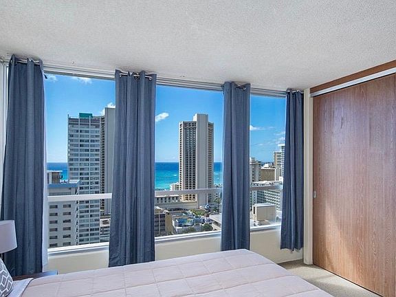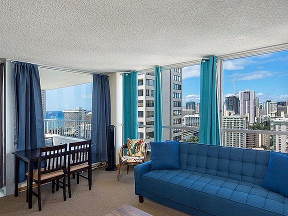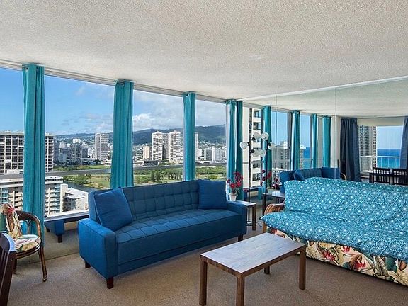 The Waikiki Townhouse offers a blend of city and sea. With sweeping views that look out across the ocean, Ala Wai Canal, golf course, and Diamond Head, the excellent vistas are the star of this comfortable unit. A full wall of floor to ceiling windows make a dramatic impact upon entering the Waikiki Townhouse. Aqua blue curtains frame the view, which forms an interesting mix of serene golf course, happening city life, and azure ocean. A full wall of floor to ceiling mirrors doubles the view's impact on the space. Comfortable furnishings provide a place to relax in the evenings in this modest home. A flat screen TV with cable, as well as free Wi-Fi provide entertainment in your downtime. Continue to enjoy the views from the kitchen, where floor to ceiling glass doors slide all the way open, merging the space between the kitchen and balcony. With double the space, it's easy to enjoy the ocean breezes and views. Keep food and drinks on hand in the full refrigerator and partake in breakfast and coffee on the lanai before heading down to the beach or to explore the city. The Waikiki Townhouse features 1 bedroom and 1 bathroom, comfortably accommodating up to four guests. The bedroom boasts a queen bed and more views that extend across the city to the ocean. Additional guests can take advantage of the queen sofa sleeper in the living room. Enjoy the convenience of a full washer and dryer located within this unit. The Waikiki Townhouse is located within a quiet, secure building with a resident manager on-site. With the ideal location within walking distance to Waikiki Beach and some of Oahu's best shopping, restaurants, and entertainment, it is easy to get out and enjoy the area. With a stay in the Waikiki Townhouse, the famed Waikiki Beach is just a five-minute walk away. This two-mile stretch of sand offers everything from relaxing sunbathing to action-packed surfing. Take your pick from a leisurely day along the shore or participate in one of the many water activities that are easily accessible along Waikiki Beach. After spending a day in the sun, it's easy to reach some of the island's best shopping, dining, and nightlife by taking just a short stroll around from this central Waikiki residence! Please note that there is NO PARKING with this rental and all utilities are included. Month to Month, 6 months, or 12 month lease.