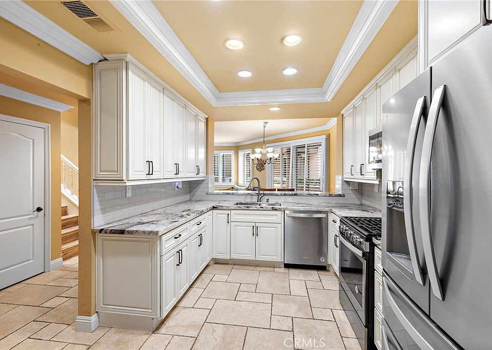 From the moment you step inside, soaring cathedral ceilings, skylights, and walls of windows flood the home with natural light, illuminating fresh designer finishes throughout. Every detail speaks of sophistication, from the travertine floors and crown molding to the striking marble countertops and high-end natural stone accents. The bathrooms feel like private spas, designed with timeless basket weave tile, dual shower heads, and luxury finishes that turn everyday routines into indulgent rituals.