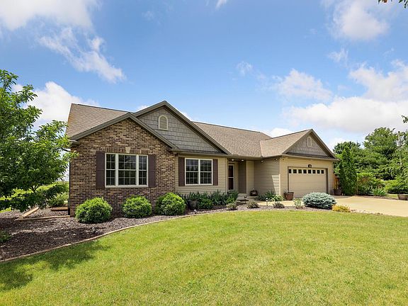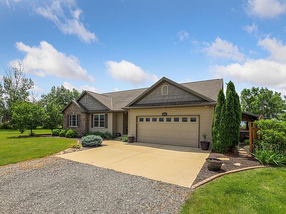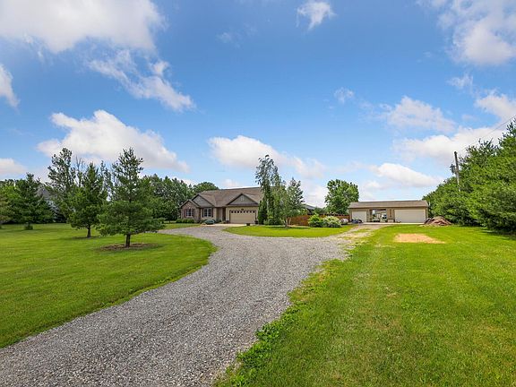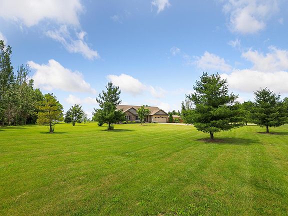 A property that has it all, and does it in style, privacy, and LOTS of space! This beautiful ranch sits on 5-acres and offers a four-bedroom, three full baths, and a finished basement plus outdoor living space like no other. The spacious eat-in kitchen offers copious amounts of storage in the cherry stained cabinets plus two pantry's, granite countertops and is complete with stainless steel appliances. Adjacent is the open living room with a vaulted ceiling and a fireplace flanked by large windows. The master suite features a full bath and a custom-built walk-in closet like no other and a private ensuite bath with heated floors! Take advantage of the additional living space in the daylight basement featuring a spacious family room, full bath, fourth bedroom and office/den w/ a built-in desk for two. 2 car attached garage plus a 3 car detached garage and a machine shed. The entertaining space is not limited to inside the home, host your gatherings outside under the huge covered deck with ceiling fans or the large stamped concrete patio w/ built-in firepit. Call today to schedule your private showing to fully appreciate all this home has to offer.