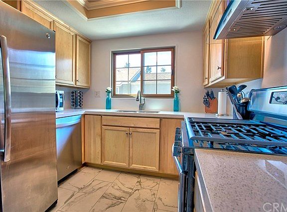 Absolutely Gorgeous Remodeled kitchen with new cabinets, Quartz counter tops, stainless steel appliances, fixtures and tile flooring. Large family room with vaulted ceiling, open to the dining area. Spacious Master Suite with vaulted ceiling and a private balcony. Remodeled master bath, new vanity, fixtures, new bath tub with stylish tile walls and floor. Specious secondary bedroom with mirrored closet doors and nice natural lighting. Secondary bath has also been remodeled, new vanity, fixtures, toilet and flooring. Additional features include new 12mm laminate flooring, base boards, and freshly painted throughout. This end unit is nestled in the Gated Community of Village Niguel Terrace I, alongside a green belt, with both balconies enjoy relaxing views of trees and the hill side. No one above or below this two bedroom, two bath condo, one car detached garage. HOA includes trash. Low tax rate and no mello roos. Enjoy the resort style Pool and Spa. Close to shops, Theaters, Dining, Hiking Trails, 73 Toll road and minutes to Laguna Beach.