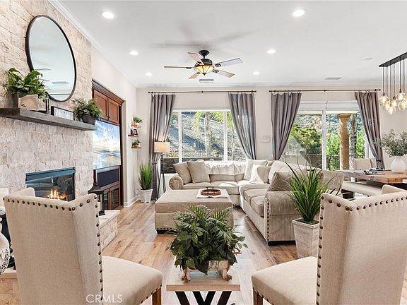 Welcome to 24217 Fawnskin, where hillside serenity meets turnkey luxury in this fully furnished Southern California gem. Backing up to open space with no rear neighbor and sweeping views, this private retreat is the perfect blend of modern comfort, designer finishes, and easy living. The charming craftsman-style exterior draws you in with its stone-accented columns, cozy covered porch, and inviting curb appeal—made even better by the HOA-maintained front yard landscaping (yes, one less thing on your to-do list). Step inside and you’re immediately greeted by a warm, open-concept layout designed to impress. Rich wood flooring flows throughout the space, anchored by a stunning stone fireplace and elevated with high ceilings, crown molding, and stylish light fixtures. The fully equipped kitchen is a chef’s dream with deep wood cabinetry, quartz countertops, stainless steel appliances, and a large island perfect for entertaining. Just off the dining area, massive windows and glass doors frame your unobstructed backyard views—and create seamless indoor-outdoor living. Out back, it gets even better. The private backyard oasis features a built-in spa with a cascading waterfall, a covered patio with ceiling fan, a mounted outdoor TV, and comfortable lounge space. All of it set against a tranquil hillside with no one looking in, just you and the sound of bubbling water under the palm trees. And here’s the best part—this home is being sold fully furnished. From the plush sectional to the chic dining setup, everything is already in place. Just bring your suitcase and settle right in. Whether you're entertaining guests or unwinding solo, this home checks every box: privacy, views, style, and convenience. Located in a sought-after community that combines scenic surroundings with low-maintenance perks, 24217 Fawnskin is more than a home—it’s your personal sanctuary.