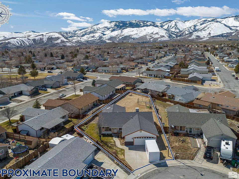 It’s housing season and the thrill of the home hunt is on. Any hunter would boast of this trophy Carson City home on Hunterwood Court. Weighing in at 1836 square feet, this prized open floor plan scores 3 bedrooms, 2 bathrooms, and a 2-car garage that was tagged on a premium 0.27-acre cul-de-sac lot. Dress deer in the large kitchen and feast on venison in the vaulted great room. Take aim and set your sights on this home, then quickly pull the offer now so you don’t let this home be the one that got away., Follow a real estate guide led by a compass bearing Carson City Northeast to track this home in the Mountain Park Subdivision and further scout mountain views and journey to the nearby neighborhood park from the premium cul-de-sac lot. The trophy curb appeal comes alive with thriving landscape quenched by automated irrigation. A meandering concrete sidewalk ebbs and flows next to river rock. The exterior wood siding has been recently colored in cream and the outlining trim in a spice hue. A rich, brick wainscot brings a balanced brindling. Pass the lodge’s threshold and behold a vaulted, open floor plan past the living room and kitchen into the great room. Traverse the living room’s forest of Brazilian cherrywood floors shining from sunbeams through large daytime windows or glistening under the moonlight glow of the evening chandelier. Fix a feast for the famished after foraging markets in the oversized kitchen glazed in new paint. Stock lots of cans and place plenty of pans in any of the many cabinets. Spread a spread across abundant countertops. Google recipes at the kitchen desk. Roast a roast in the new built-in oven and warm gravy in the new built-in microwave. Cook dessert in pots and Pyrex on the new gas stove built into the kitchen island, large enough to be comfortably deserted on. Prerinse bowls in the double-bowl sink, then machine wash in the built-in dishwasher. Binge on breakfast at the kitchen’s bar and dine on dinner at the great room’s table. Spend time in the family room of the great room, newly freshened with new carpet and fresh paint. Keep evening time not by chiming clock or pinging phone, but by the silent setting of the sun past summits out the westward facing windows. Feel the cool nighttime breeze ushered in past the patio door. Preside as master of the hunt and reside in the newly painted suite. From the vaulted ceiling hangs a fan that wafts drafts downward. Take advantage of the mountain vantage through the large vista window or outside, beyond the patio door to the backyard. Wash away the day’s dirt in the shower stall or at either of the dual vanity sinks with medicine cabinets of the ensuite. A water closet provides privacy. Hang casual clothes, work wear, or hunting garb in the walk-in closet. The two guest bedrooms have been updated with new carpet and paint and feature vaulted ceilings and reach-in closets. The hallway bathroom accommodates guests with a single vanity sink, medicine cabinet, and a shower and bathtub combination. Path down Brazilian cherrywood floors past the HVAC controls, coat closet, sleeping quarters, and the bathroom of the long hall’s ways to reach the utility closet housing the home’s natural gas water heater and furnace and, finally, the laundry room that opens to the garage. Park up to two vehicles in the attached garage with automatic door. Tinker on the workbench and store trinkets on shelves and rafters. A blank slate, the large backyard brings this home, home. Expand upon the concrete patio and design your favorite way to enjoy the backyard while enjoying the mountain views. Situated in phase 4 of Mountain Park Subdivision’s 14 total phases, this home exemplifies the subdivision’s name with unobstructed mountain views from the large backyard and through west-facing windows, and the proximity to parks including Blackwell’s Pond Park, Steinheimer Park, and Fulstone Park. Shop at varied stores and eateries anchored by Walmart and Home