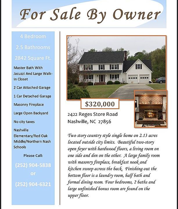 Two story country style home located outside city limits. Beautiful two-story open foyer with hardwood floors. Masonry fireplace in family room. Spacious master bathroom with Jacuzzi tub and walk-in closet Unfinished bonus room over garage with electric and HVAC already connected. Large backyard. Nashville Elementary/Red Oak Middle/Northern Nash schools. All new windows installed less then a year ago.