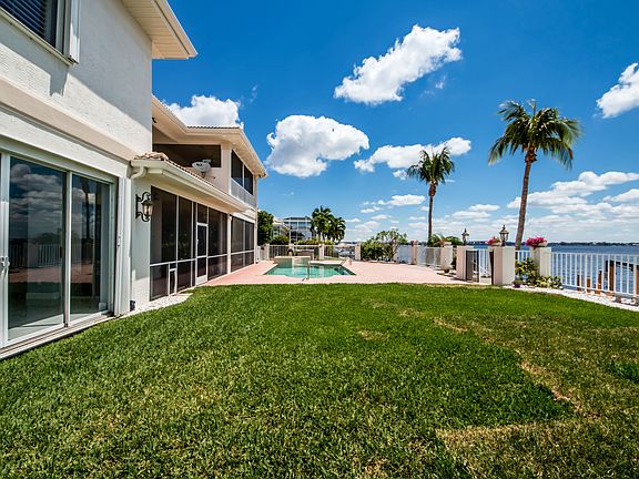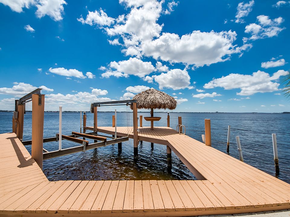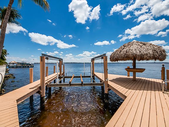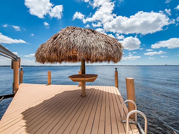 Contemporary 5400SFT Home with magnificent views of the Caloosahatchee river and southern rear exposure. This property features 5 Bedrooms, DEN, 4 Bathrooms, a powder room, SAUNA, Entertainment Room and a huge Gourmet Kitchen with gorgeous granite and plenty of cabinet space. Two Master Suites- both with stunning water views; Master Suite upstairs with screened in Balcony and Master Bathroom with Jacuzzi tub. Outdoor features include a huge lanai with many Lounge and Gathering areas, a Heated Pool with Jacuzzi, and large boat dock with with lift and TIKI HUT. This property features a 3 car garage and and is being SOLD furnished. Check out the Virtual Tour!