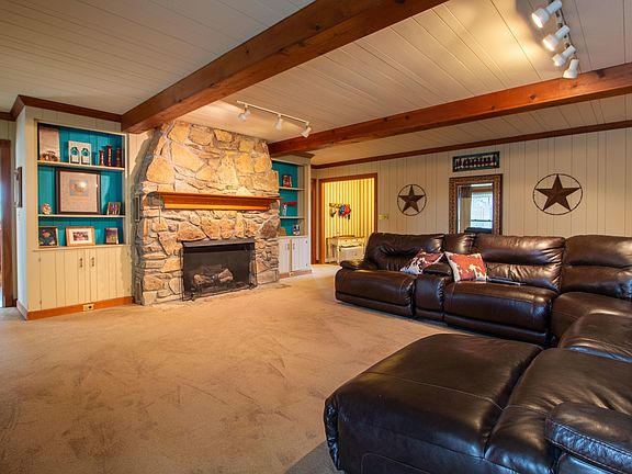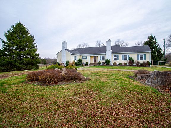 Incredible country estate sits on over 11 acres & is just 30 minutes from downtown Louisville. Inside the entryway leads to the large family room with exposed wood beams, stone fireplace & built-in bookcases. The spacious kitchen is complete with lots of cabinetry, island, 3 working ovens & separate spacious dining area with another fireplace. The Florida room is the perfect place to sit & enjoy a cup of coffee while watching the sunrise. The primary bedroom has a third fireplace, built-ins & en suite bath with whirlpool tub, stand up shower & walk in closet. A second bedroom, another full bath, & laundry complete the main floor. The finished basement offers additional living space perfect for entertaining family & friends! Outside there is a deck, patio with firepit, lake & barn!