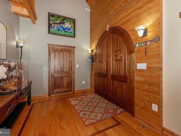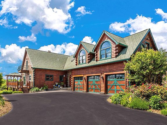 The majestic “Hennessey” log mansion, as featured in Country’s Best Log Homes’ article, appropriately entitled “Dream Fulfillment”, incorporates the best design elements from the most ambitious resort style homes.This stunning estate is harmoniously situated within a 5 acre bucolic setting among unique and mature specimen trees,landscaping, and gardens.Enter your grand home through the giant arched wood doors with wrought iron hinges and speakeasy window.The front doors, chimney, foundation, and other areas are accented by real stone,adding a certain rustic gravitas to the home.This stonework is mixed throughout the interior and exterior,a pleasant complement to the Northern White Cedar, and in perfect balance with the solid walnut doors and carved wood mantels. You will be awe-struck as you stroll down the foyer and pass under the custom truss and beamed ceiling over the great room. The great room is flooded with natural light flowing through the fan window at the peak of the 24-foot cathedral ceiling. The great room’s bump-out is the perfect space for a cozy afternoon nap near the oversized fireplace. This alcove overlooks the vast backyard gardens, heated saltwater pool and waterfall,and an expansive patio. Flanking the great room are the kitchen and dining rooms and the primary suite. The desirable first floor bedroom provides access to a walk out deck, gazebo and a hot tub to enjoy evening sunsets. This suite has a natural beamed ceiling and a noteworthy bathroom boasting a steam shower and a custom designed stonework tub surround. The first floor kitchen is easily accessed from the 3 car garage. The open kitchen has a large center island with a cooktop and plenty of counter space for socializing. The dining room features a stone fireplace and has French doors leading to a large deck and gazebo for outdoor entertaining with a view, or for a quiet evening around the firepit. Two bedrooms on the upper floor rival the size of the primary suite and include walkout balconies, giant arched windows, bathrooms and ample closet space. Each has intriguing ceiling designs and patterns in wood. Between the two bedrooms is a balcony sitting area overlooking the great room and a large open area leading to the private library, an indescribable architectural masterpiece with a cozy fireplace, balcony, and ample windows. The lower level is an entertainer’s paradise, including: a large main social and dance area with built-in bar and “cantina-style” seating, a temperature controlled 2000 bottle wine cellar, an extra large stone fireplace, and a theater area and billiard room with a beautiful stone alcove. Another comfortable bedroom and a similarly sized resting room and office adjoin the main room and bathroom. The lower level ties into an oversized fenced patio area and an outdoor kitchen and bar with underdeck drip proof seating areas. Stroll through the thoughtfully designed landscape to your koi pond, salt water pool, stone waterfall with hot tub. The layout is ideal for a large gathering or a secluded day under the shady wisteria-laced pergola. The yard area boasts 2 barns, greenhouse, fenced vegetable garden, and untypical trees in quality and quantity. Rare and stunning trees adjoin the neighboring forest reserve area providing additional privacy. The main barn has HVAC, water, electric, natural gas, and a full bathroom next to the gym area. The second floor lofts are bridged by an overlook with 1-ton hoist to the lower level. Four large 9ft tall drive-in doors allow for plentiful uses for contractors, auto buffs, woodworkers, landscapers, boaters, artists, and other craftsmen and hobbyists. You will be amazed by the charm and functionality of this building. The second log sided barn is two stories with electric, and water outside. Great for your tractors, animals or storage and nearby the newer greenhouse with power, electric and water. Feel like you're on a mountain vacation every time you step into your home!