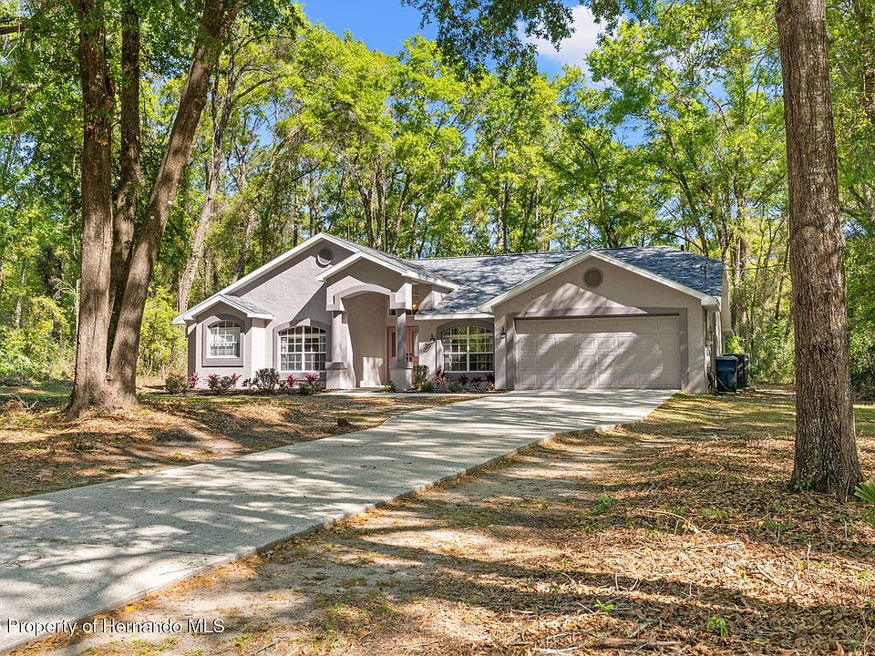 Looking for a woodsy and peaceful home that retains the security and comfort of a neighborhood? This lovely 3 bedroom home with an office, 2 baths, a 2 car garage, and a screen-enclosed pool rests on 1.1 acres on a quiet cul-de-sac in the established Nottingham Forest community near Croom Forest. With just over 2,220 square feet, this well-maintained home offers space for family living and entertaining, while boasting a designated place to work from home or enjoy hobbies. Fresh paint and landscaping provide a beautiful entry to the home, while woods and nature offer a peaceful and natural backdrop for poolside and outdoor living. Brand new appliances, a roof that was replaced in 2022, New carpet 2022 and a one-year home warranty provide extra peace of mind for new owners. This is an exceptional opportunity to live away from the hustle and bustle without sacrificing the conveniences of suburban living. If you are unfamiliar with the desirability of the Croom Forest location, this property is well worth exploring not only to become better acquainted with this particular home's appeal, but also to become familiar with the many outstanding opportunities for recreation including hunting, hiking and trail riding on horseback. The larger community of Brooksville which is located on Florida's Nature Coast in Hernando County is a friendly and fun place to live, work, and play. See it soon!