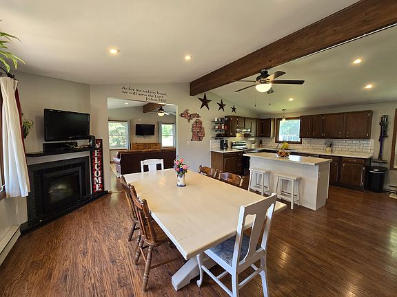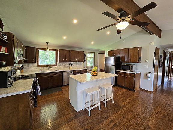 The living room is the perfect place to relax with its vaulted ceilings, impressive header, and cozy wood stove. Every bedroom has been refreshed with new paint. The master en suite has a new ceiling fan and a completely redone attached half bath. Outside, you'll find a 2 car garage with a large lean-to, and multiple sheds for your tools and toys, firewood, or other storage. The kids enjoy the fenced back yard and included swing set. Multiple air conditioners and a vinyl privacy fence makes relaxing a breeze. This home was reinsulated with new exterior foam board and brand new house wrap under the current vinyl siding.