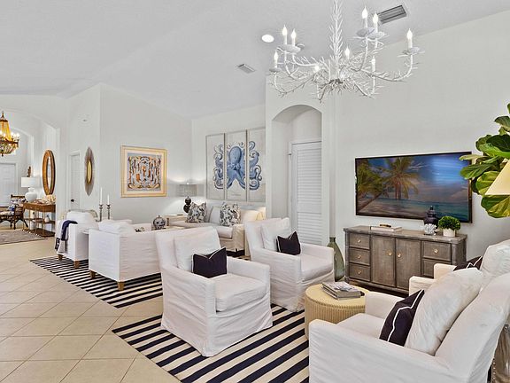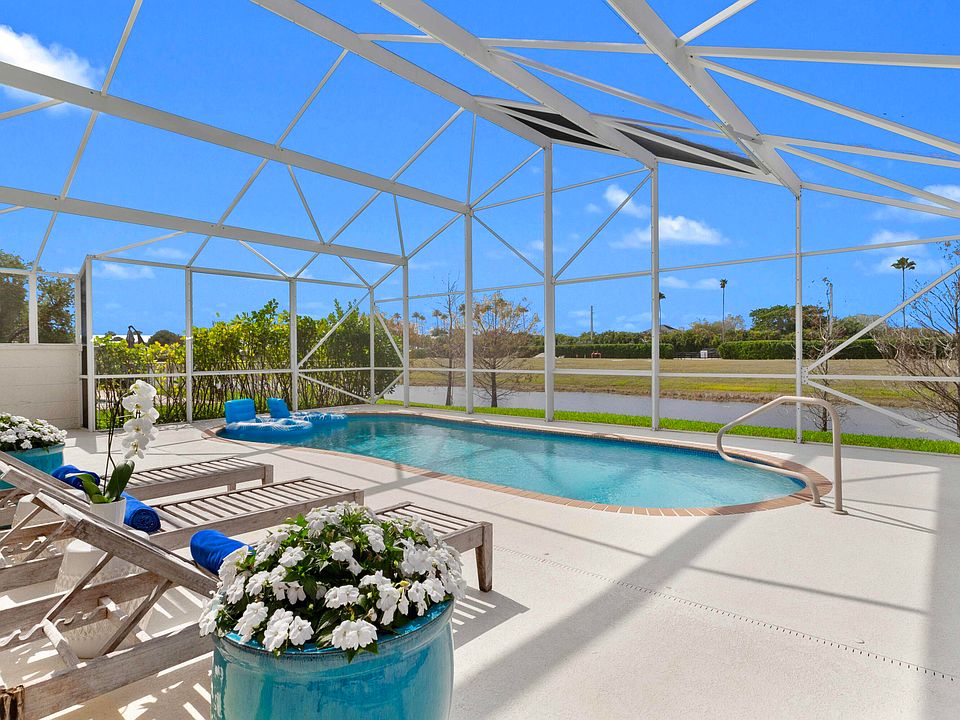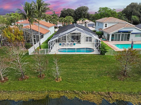 This stylish, renovated and nicely decorated home is located in Wellington's premier gated community of Lakefield South, next to the exceptional private golf and country club, the Wanderer's Club. The well maintained property offers 3 bedrooms, 2 full bathrooms, a 2-car garage, covered patio, a fully screened-in pool, fenced grass side yard and gorgeous sunset views over the water. With 1,943 square feet of living space, the inviting, open interior features vaulted ceilings, fresh paint throughout, a formal dining space and a beautifully upgraded kitchen with a large island and bar seating. Both bathrooms were recently renovated, boasting luxurious finishes and a modern design. The primary ensuite includes dual sinks, walk-in shower and a beautiful freestanding tub. Stepping outside, you can enjoy a covered dining area on the patio, lounging on the large deck, or a dip in the heated pool! The property also offers a fully fenced-in side yard for your pets, a fresh exterior paint job, NEW metal roof (Dec, 2024), new AC, newer pool pump + heater (approx 5y old) plus hurricane accordion shutters throughout for peace of mind. Just a short golf cart ride away from The Wanderer's Club that offers a variety of upscale amenities, including a championship golf course, tennis courts, a fitness center, and fine dining. The community also has a shortcut to the horse show for golf carts and bikes, that takes you there in minutes. The tasteful furnishings are negotiable.