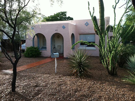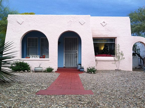 1920's Joesler-esque pueblo home and mud-adobe guest home, each of them 2BR/1BA. Main home and has wood floors, covered ceilings, archways, French windows, fireplace, updated kitchen with colorful tiles. Guest house built in 1982 has high beamed ceilings, open kitchen, bathroom with talavera tile, living room with fireplace, polished and scored concrete floors throughout. Casita has great income potential. Each home equipped with refrigerator, stove, washer and dryer. Separate garage/storage building with workshop, nice yard with a variety of flowers, trees, and citrus. Great Blenman Elm Neighborhood, walking distance to UA, UMC, Arizona Inn, Medical Square and restaurants, shops, and offices of Speedway.