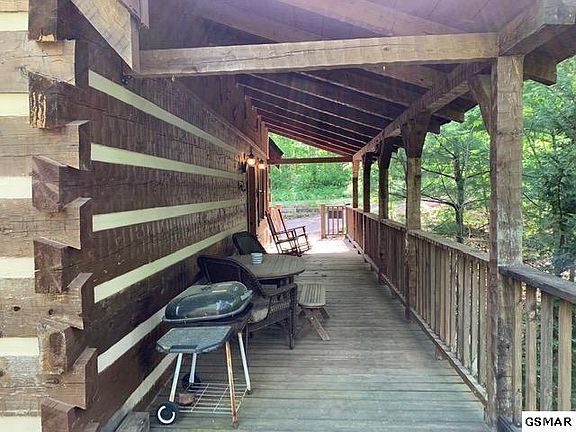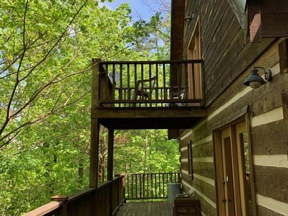 A beautiful log home that has never been a overnight rental. Wood floors beautiful stone masonry fireplace. Paved circular driveway. Log beds and furniture. Stone floors and countertops in the kitchen. Wraparound deck. Whirlpool tub in master. Double sinks in master bath. So much to list with many personal touches. All information was taken from the county tax records and measurements are approximate. The buyer should verify all information.