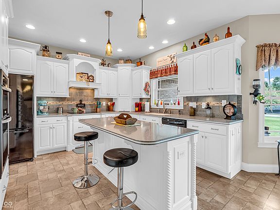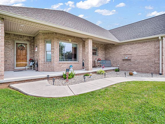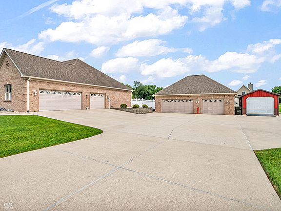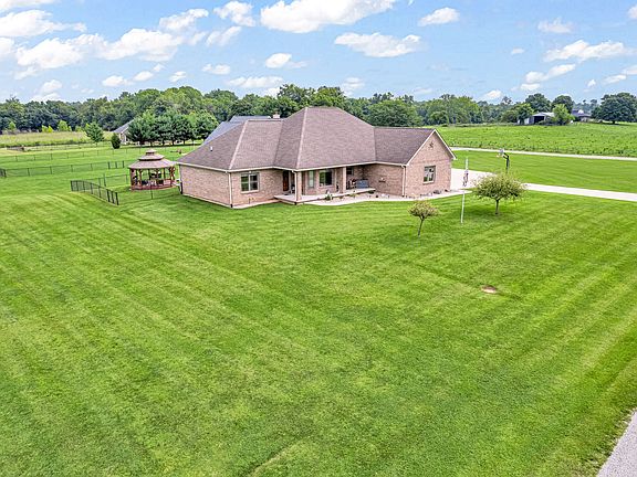 Amazing custom-built home on 2 acres that doesn't come along often. This brick ranch with a full basement, 3-car attached garage and 3-car detached garage is a short walk to the DePauw Nature Park and surrounded by other high-end custom homes. The first floor features open-concept living with tall ceilings, 3 bedrooms, 2 1/2 baths, a dedicated office, walk-in pantry, laundry room, dining room with bay window, and white kitchen with custom cabinetry and upgrades. The primary suite has tray ceilings, a large walk-in closet and full bathroom with double sinks, jetted tub and shower stall. The kitchen includes all appliances, double oven, center island with bar seating, double sinks, range hood, and so much more. The full basement features three large rooms for gaming, movies and gatherings; as well as a large storage room with built-in shelving. A large finished attic above the garage gives you even more storage. Enjoy the fenced backyard with large gazebo and fire pit from the covered back patio. The brick 3-car detached garage is a dream for anyone wanting a workshop, studio or hobby space. The full concrete driveway includes a basketball court. High-speed internet available. This meticulously-maintained home is conveniently located close to town on paved roads, but has the quiet and nature of the countryside.