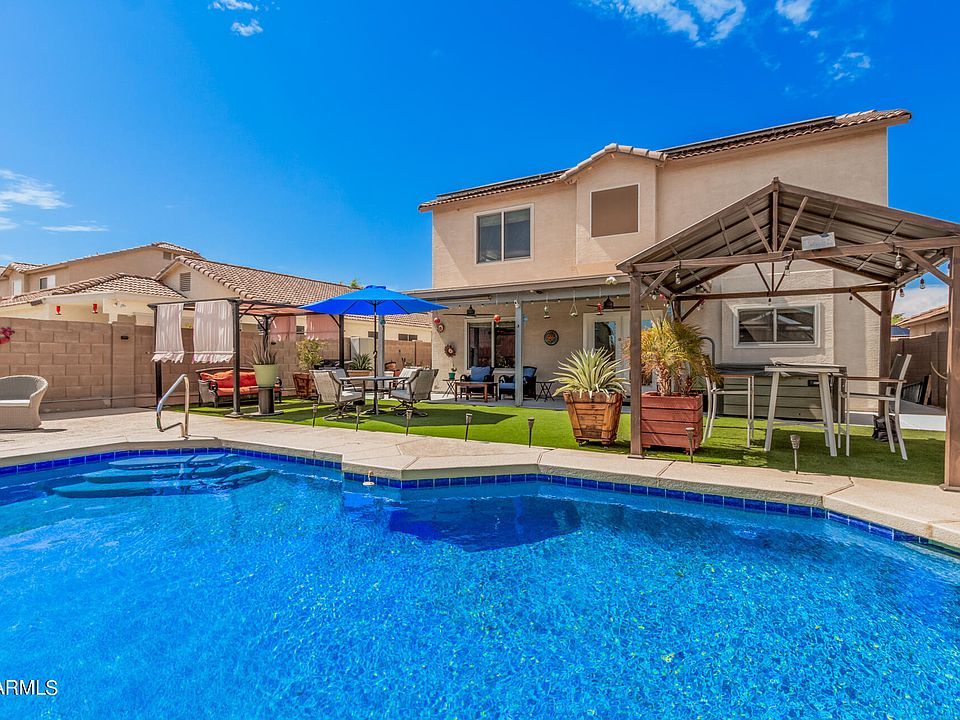 Gorgeous two-story home with a 2-car garage, shaded front porch, and stunning backyard! Cozy living areas filled with natural light, high ceilings, newer plush carpeting and tile. Kitchen features SS appliances, granite counters, rich wood cabinets, a pantry and breakfast nook. Comfy loft is ideal for reading or watching TV. North facing windows offer beautiful mountain views. Large main suite offers a full ensuite, walk-in closet, and large windows overlooking your backyard oasis. French doors guide you to your backyard paradise featuring an extended covered patio, a gazebo, a pergola, a hot tub, and a crystal blue pool! Many new mechanicals, including new windows, new AC, water heater & softener. Seller is including a home warranty and all backyard furnishings! Don't wait on this one!