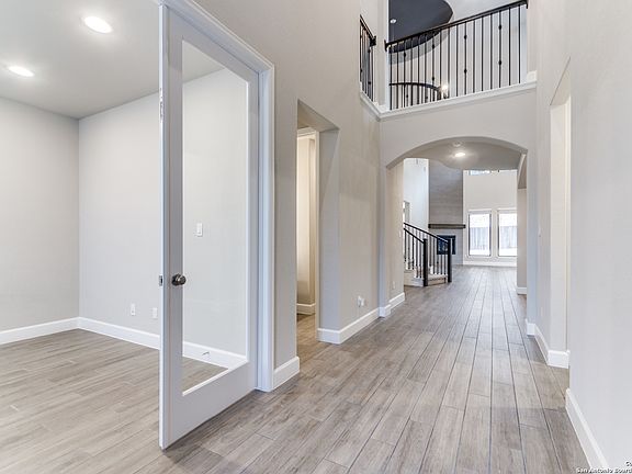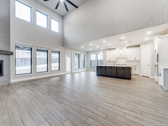 PRICE DROP!!! Former Model Home!! Come to your dream home in this vibrant community in Cibolo Canyon, where luxury meets convenience. You will be mesmerized by the stunning two-story curved staircase in the entryway. Glass French doors that lead to the entryway of the home office. A stunning curved staircase is the focal point of the formal dining room. Welcome to a family room with a two-story high ceiling, large panel windows, ensuring the interior are bathed in bright, natural light and an impressive view. The large island kitchen is a chef's dream, boasting upgraded counter tops, a convenient breakfast bar and a 5-burner gas stovetop. Sliding glass doors and a wood mantel fireplace are one of he main features of the family room. A luxurious 12-foot ceiling is present in the primary bedroom. The guest suite has a secondary bedroom and a full bath located downstairs. A walk-in closet with access to the utility room is included in the primary bath, which also features dual vanities, a garden tub, and a separate glass-enclosed shower. This stunning property offers access to an expansive amenity center, featuring a sparkling pool perfect for sunny days and family fun. Unwind on the beautiful patio, ideal for relaxing evenings or entertaining guests. Functional mud room next to the garage that can accommodate three cars . The added perk of no city taxes makes this home even more appealing. The features in this home are outstanding and the upgrades are plentiful!