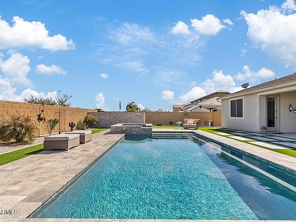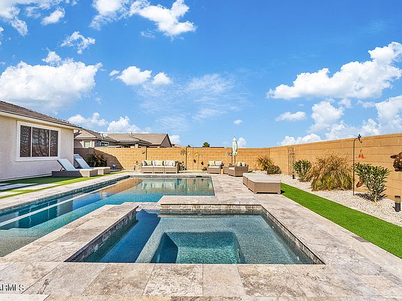 Step outside to discover a backyard oasis that promises endless hours of relaxation and entertainment. The custom landscaping includes synthetic grass for low maintenance year-round, while the citrus trees add a touch of nature's bounty to your doorstep. The centerpiece of this outdoor paradise is the gorgeous saltwater pool built in 2021, complete with travertine surround tile and custom pathways. The 8-person spa - is perfect for unwinding after a long day or hosting memorable gatherings with loved ones.