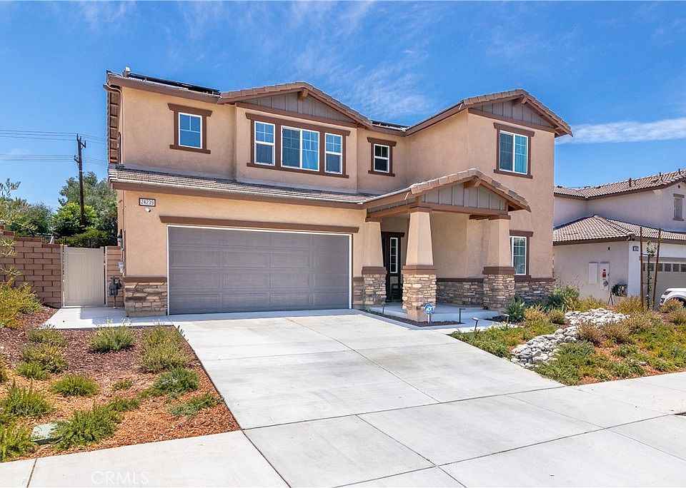 Welcome home to 24239 Dusty Trail Way located in the highly sought after community of Audie Murphy Ranch. This almost new home features a bright foyer upon entry leading you to the spacious living room which adjoins the well-appointed kitchen offering kitchen island with breakfast bar, stainless steel appliances and beautiful cabinetry. Down stairs you also have private guest rooms with full bath. Upstairs you are greeted with a huge loft area, primary suite, 2 additional guest bedrooms and guest bath along with spacious laundry room and additional storage room. Primary Suite has large windows allowing for tons of natural light and adjoins the primary bath with dual sink vanity, huge walk in shower and spacious closet. . This 2-story smart home is equipped with all of the latest smart home equipment to include Amazon Echo, Skybell smart video doorbell, Qualsys IQ Panel with total home connectivity screen, Honeywell Pro-Z Wave Thermostat with wireless capability, Camera/Alarm system and Solar Panels! Tastefully done backyard has concrete patio, artificial turf and raised garden beds. To complete this package this home has a 2 car garage, solar and walking to distance to parks. All conveniently located in Audie Murphy Ranch with resort-style amenities to include 3.8 Acres with 3,149 Sq. Ft. Recreation Building,Two Swimming Pools, Spa, Tot Lot, Grassy Amphitheater and Game Area. Close to both freeways, schools and shopping.