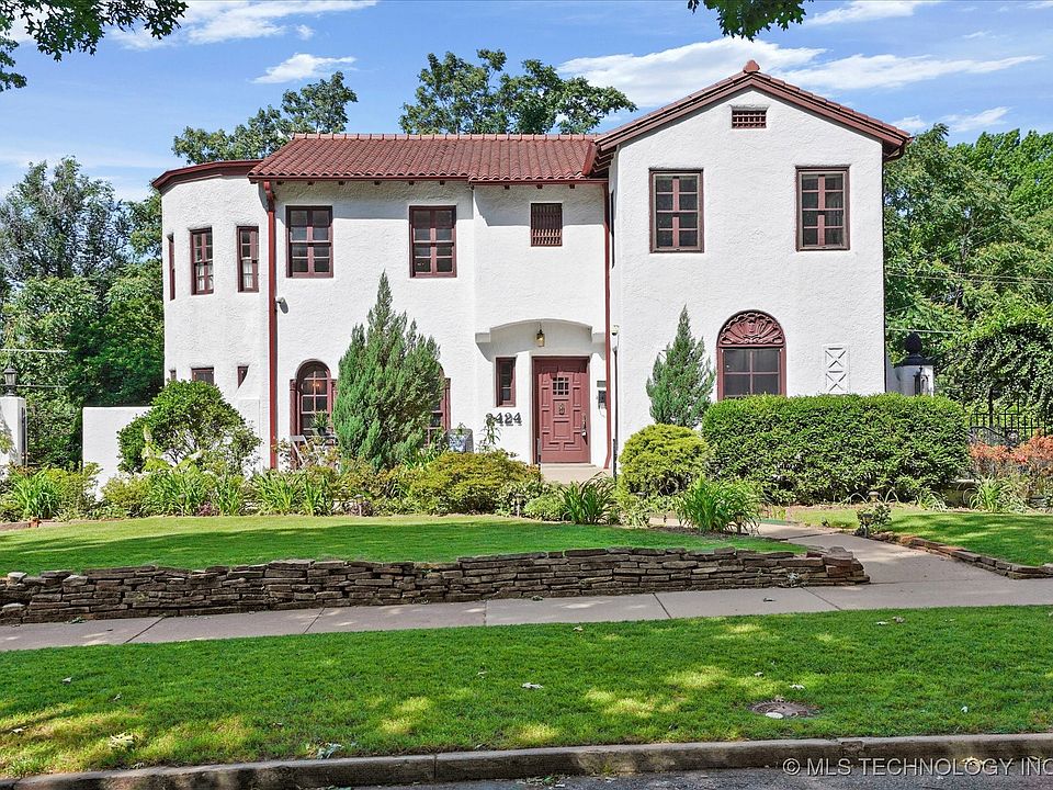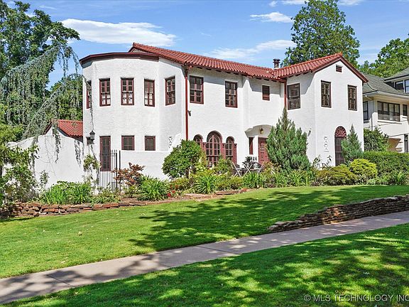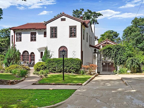 Stunning Mediterranean architecture in Maple Ridge! Remodeled kitchen features ample cabinet space, granite, double ovens, built in refrigerator, double freezer drawers, and induction range. Two spacious living areas with gas log fireplaces, Elevator (3 levels), 5 bedrooms, 3.5 baths, office, and grand formal dining room. Primary suite includes fireplace, large walk in closet, bath with beautiful granite, double sinks, separate shower, whirlpool tub and heated floors. Larger lot with mature trees, koi pond with water feature, green house, chicken coop, and sprinkler system. Front porch patio, side deck, and second story balcony for relaxing/entertaining. Entire interior painted (5/2025), refinished original hardwoods throughout (3/2024). Nice sized garage with mini split and bathtub (would make great dog wash station). Newer tile roof -all within last several years. Great neighborhood and street - Council Oak school district. Close to Gathering Place, Brookside, Cherry Street, shops, and restaurants. This is a one of kind GEM!