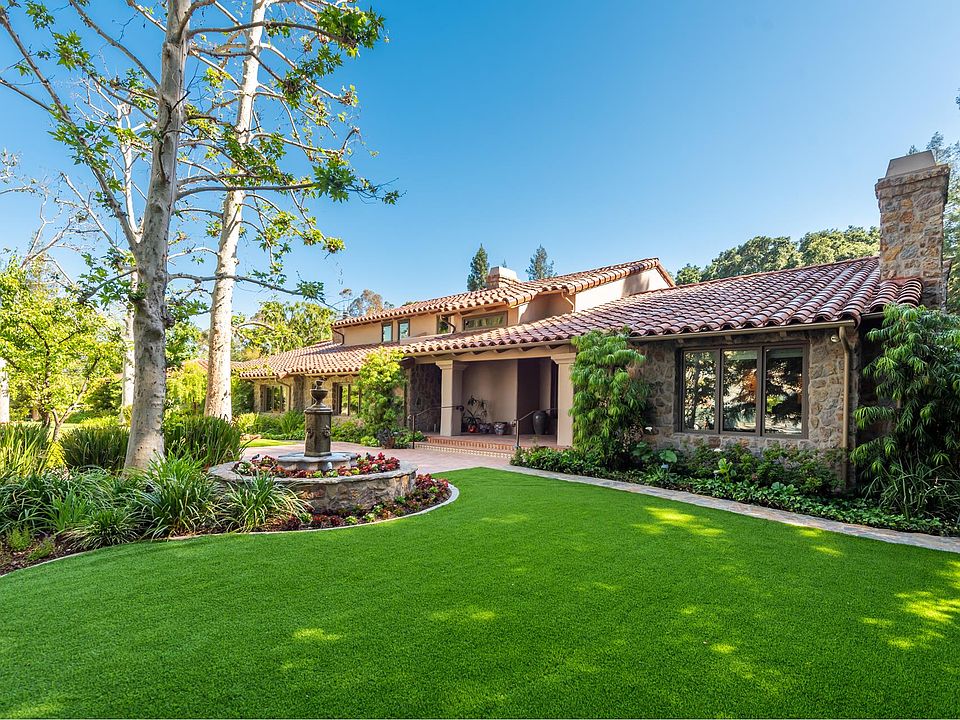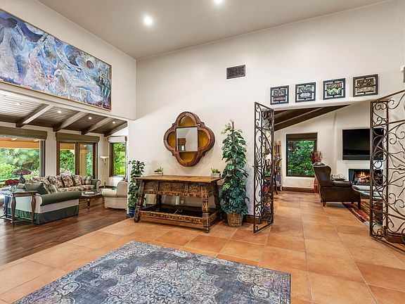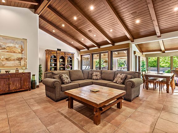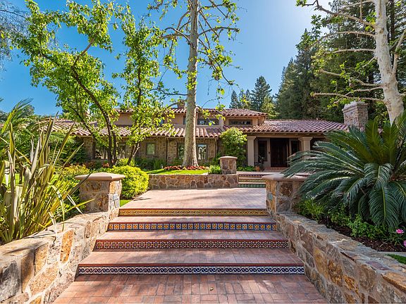 Nestled at the end of a quiet cul de sac, and sited on a beautiful, lushly landscaped, and very private 1.61 acre lot, this timeless Spanish estate awaits. This fully integrated, seven bedroom, eight bathroom smart home is model sharp and casually elegant throughout. Interior highlights include a highly upgraded, center island kitchen with stone countertops, bar seating, Wolf stainless steel appliances, and a spacious breakfast nook, all surrounded by rear yard views, and flowing seamlessly into the large, yet inviting family room with open beam ceilings, impressive stone fireplace, and big picture windows overlooking the manicured grounds. Additional interior amenities include a Sonos sound system & security camara system throughout, plus an intimate second family room with wet bar & fireplace, large living room with open beam ceiling, formal dining room with coffered ceiling, and two first floor bedrooms currently finished as custom offices. The luxurious and secluded upstairs primary suite includes an open beam vaulted ceiling, sitting room, fireplace, and two covered verandas, while the primary bath is complete with steam shower, whirlpool spa tub, heated floors, dual vanities, two water closets, and two generous walk-in closets. There is also ample, thoughtfully designed storage throughout the home. For the auto enthusiast, the attached garage parks eight large vehicles, two of which are secured in an underground car vault with high capacity lifts. The garage is also replete with additional storage. The expansive grounds offer mature trees, beautiful gardens, a full coverage Sonos sound system, a 1,200' smart guest house featuring two large bedrooms, a full bathroom, kitchen with stone countertops, bar seating and dinette area, with beautiful views of the rear yard. The rear grounds also feature a sparkling micro-pebble finished pool with Baja shelf & multiple water features, a spa with separate water features, a large covered pavilion with outdoor theater, & ample seating, a fruit orchard, a gorgeous barbecue center with Wolf Appliances & counter seating for eight, plus 3 large custom fire pits, multiple terraces and patio dining. The home also features handcrafted architectural details & beautiful hardwood floors throughout. The property shows very well throughout and is ready for the next family to call it home.
