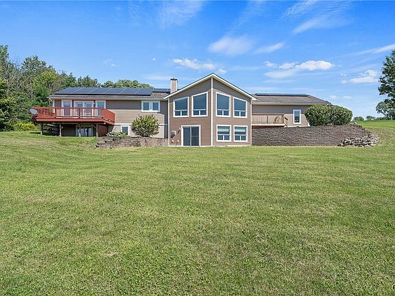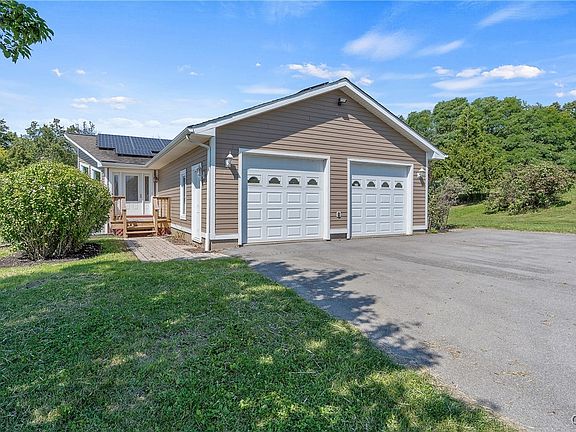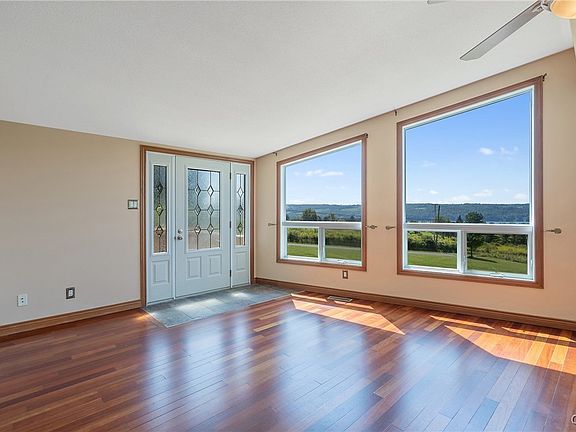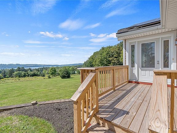 Check out this spectacular water view! Nestled in the hills of Skaneateles Lake, this stunning ranch property offers a rare opportunity to own a slice of paradise. Set on just over 2 acres of professionally landscaped grounds, this freshly painted, immaculately maintained 4 bed 3 bath home showcases breathtaking water views with lake access. Upon entering, you are welcomed by large, framing windows bathing the open floor plan in natural light, perfect for both everyday living & entertaining. Off the kitchen area, you’ll find a porch for outdoor dining. The luxurious primary suite boasts a walk-in closet, spacious bathroom, & private deck overlooking the lake. A finished walk-out basement, expertly constructed by the renowned Kistner Concrete Products Co., adds valuable living space, a kitchenette, bedroom & full bathroom. The basement has separate garage access, ample storage, & built-in saferoom for added security. Energy-efficient solar panels significantly reduce utility costs. With its prime location, thoughtful design, & impeccable condition, this Skaneateles gem offers the perfect retreat for those seeking tranquility & sophistication on one of NY’s most beautiful lakes.