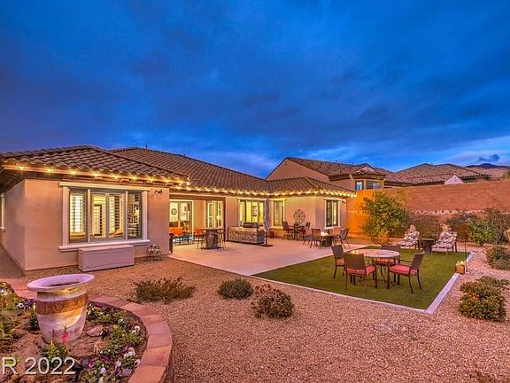 Popular floorplan with views of Sloan Canyon has spacious great room with surround sound speakers, large, picturesque glass multi-slide doors leading to the backyard, creating indoor-outdoor living at its finest. The kitchen has marble counters, tile backsplash, large island with breakfast bar, 2-walk-in pantries, stainless steel appliances, including double ovens, 5-burner cooktop and microwave. Formal dining is connected to the kitchen via butlerâEUR(tm)s pantry. Primary retreat has door to the backyard, large walk-in closet, 2 vanities, separate tub and shower. Secondary bedrooms have walk-in closets and connected by a Jack and Jill bath. Upgrades like wood ceiling inlays, plantation shutters, custom lighting, laundry room with sink and cabinets, 3 car garage with epoxy floors, wired for alarm and more. The backyard sits high above the canyon and is perfect for entertaining with serene panoramic views, lush landscaping, covered patio with solar shade, BBQ, outdoor speakers, fruit trees.