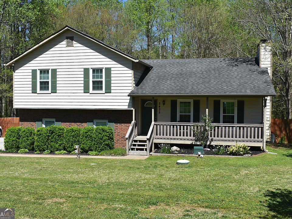This cozy split level home sits on almost an acre in a quiet neighborhood with no HOA. Plenty of room in this 3 bedroom, 2 bath home with a large eat-in kitchen and family room. Beautiful crown molding is in every room throughout the home as well as new windows installed in 2021.Downstairs you'll find a den and the laundry room as well as the drive under garage and storage. Carpet throughout upstairs and flooring in both baths and den have been updated. Whether you're enjoying quiet moments relaxing on the front porch with your morning coffee or hosting gatherings, this space is sure to be enjoyed. The home is located just minutes from the Mall of Georgia, shops and restaurants and offers quick access to I-85.