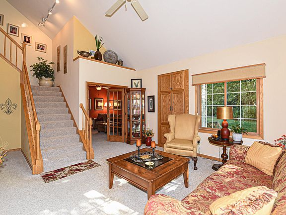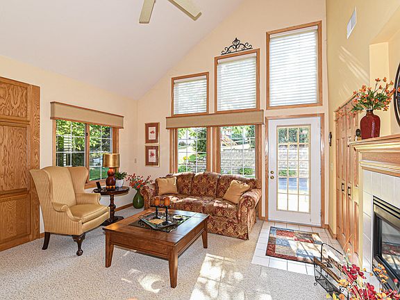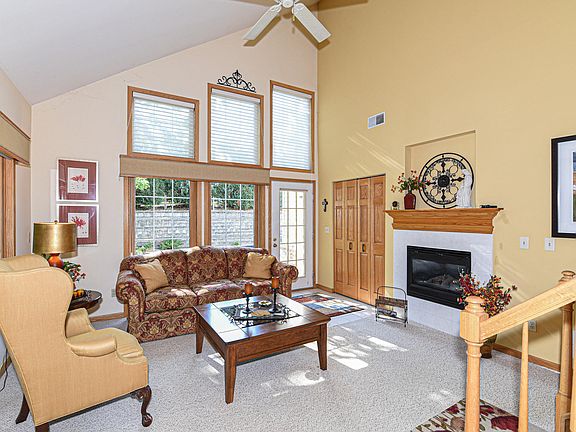 Prime location. End unit with private entry and patio. Peaceful setting overlooking a wooded area. Vaulted great room with beautiful transom windows allowing plenty of natural lighting and gas fireplace. Kitchen features silestone countertops with ceramic tile flooring. Upper loft area perfect for home office. Master suite with walk in closet, ceramic tile and separate vanity. Furnace/AC two years old. Walk out and enjoy the amenities of the Fox River Trail!