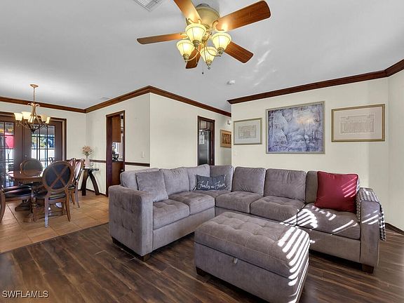 Welcome to Fort Myers Villas. This 1700+ sq ft pool home has 3 beds and 2 baths with bonus room. NO HOA FEES, COUNTY ONLY TAXES, NO FLOOD ZONE! This home is highlighted with Warm Acacia flooring and crown molding that greet you as you walk through the front door into the living and dining areas. The kitchen boasts cherry wood cabinets with crown, granite counters, tile backsplash, breakfast bar, and stainless-steel appliances including JenAir cooktop and oven. The master suite features Spanish tile flooring, wood ceiling, sliders to the pool, walk-in closets, and an ensuite bath with a shower. Two additional bedrooms with a designated bath are located the opposite side of the home, providing privacy for family or guests. A large den area with a wall of sliders opens up to your expansive private lanai area and pool, creating a perfect space for morning coffee or entertaining. The fenced yard offers ample space for children and pets to play. Conveniently located for easy access to shopping, entertainment, schools, hospitals and RSW airport. home is ready for you and your family—come make it your own.