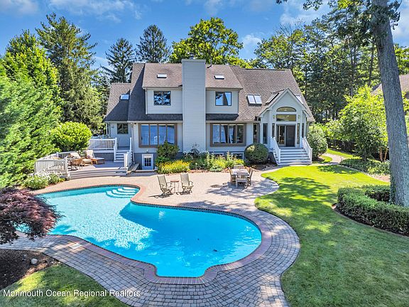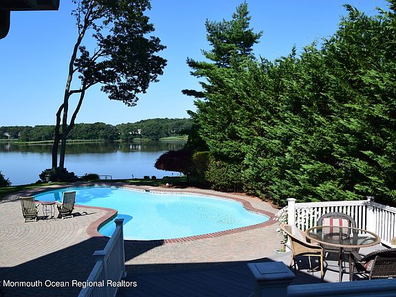 Enjoy this custom-built home with one of the most beautiful locations on the Manasquan River. Amenities galore in this one-of-a-kind home that has been updated with arched doorways, new architectural landscaped riverfront property. Exquisite master bath, plus sunroom addition to the 1st floor master bedroom w/elliptical window- overlooking the grounds & river. Cathedral ceilinged foyer w/balcony, leading to expansive open floor plan, boasting a raised hearth FP w/one of a kind windowed views. There is an additional formal DR, 3 bedrooms up & a separate newer staircase leading to an additional spacious den for a home office or an overflow guest area. With numerous inlaid patios by the Gunite free form pool in the riverfront areas,plus new decks & sandy beach-nature abounds. Spectacular! plus new decks & a sandy beach, nature abounds. Spectacular!