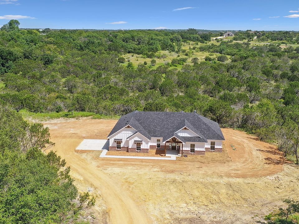 New Construction! Be the first to own this beautiful split bedroom farmhouse style home sitting on 2 acres with plenty of elbow room. Stunning scenery out of every window in this home, they show off the hill country that Bluff Dale, TX offers. From the foyer you will find beamed accents throughout the open floor plan. Beautiful kitchen that is light & bright with lots of storage, quartz countertops, breakfast bar with ample seating, farm sink, accent lighting, walk-in butler pantry open to the dining area. Living room is large with WB fireplace, lots of windows a very inviting. Primary bedroom is large with ensuite that holds dual vanities, free standing tub & large shower, spacious closet that leads to the utility room & holds lots of storage. Convenient mudroom with bench & cabinetry. Back porch patio shows off the landscape, trees & wildlife and is great entertaining. Ease of access to the Mt. Lakes main entry, pool, two lakes, clubhouse, garden area, RV parking, & storage.