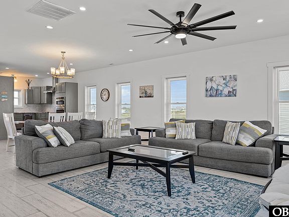 This semi-oceanfront vacation home, built in Rodanthe in 2024, offers over 2,500 square feet of living space just steps from the beach. It is an ideal coastal retreat with breathtaking ocean views, featuring 4 bedrooms, 4.5 bathrooms, and multiple decks on both the east and west sides. Throughout the interior, durable and stylish LVP flooring, flat panel doors, and attractive fixtures complement the comfortable floor plan, reflecting the builder's attention to detail.