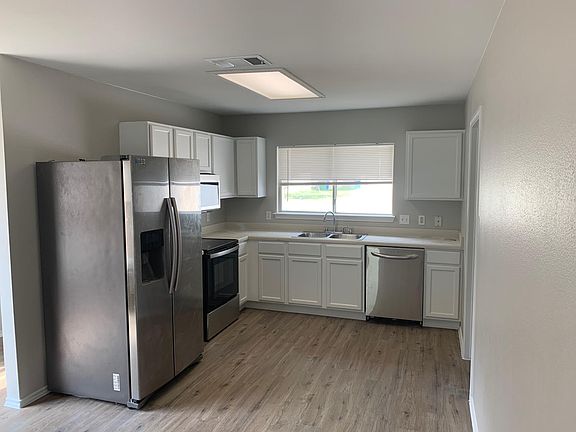 Recently updated 3/2/2. brown wood like floors through out , grey paint, white trim white cabinets. Stainless steel appliances. large back yard.